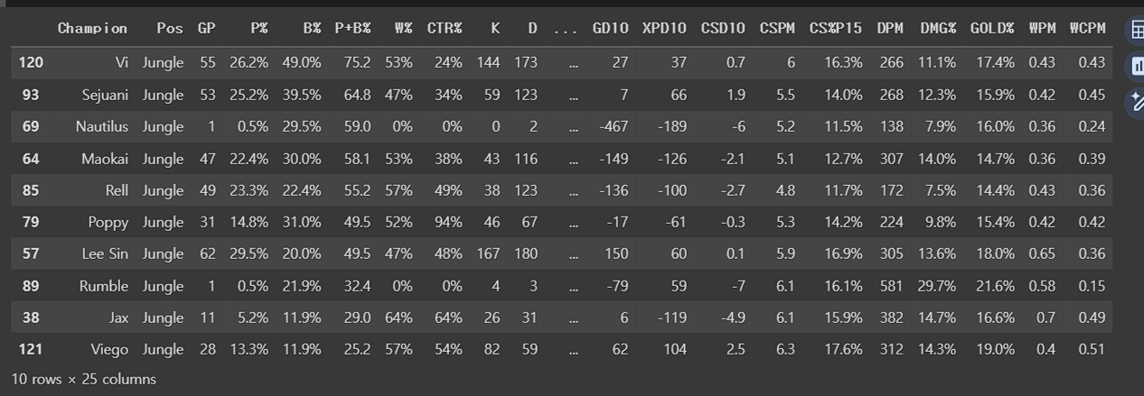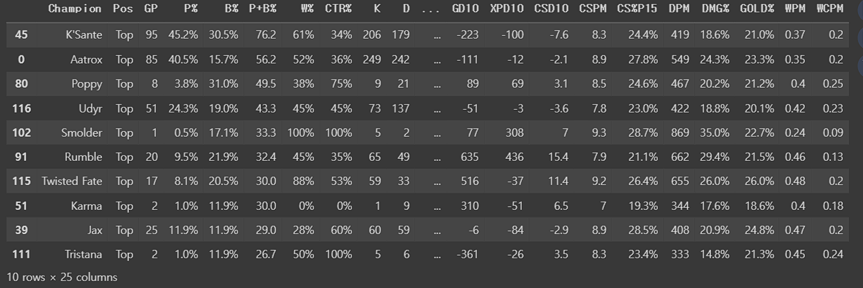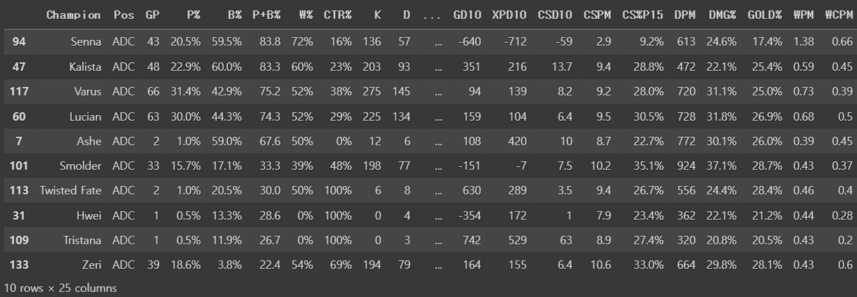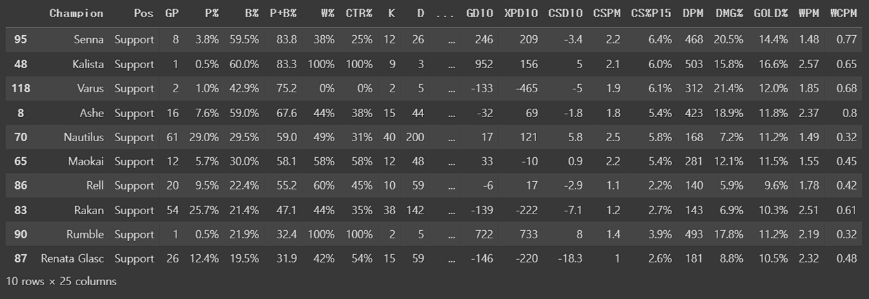 포지션 별로 가장 밴픽률이 높은 챔피언 10개씩 추려보자.