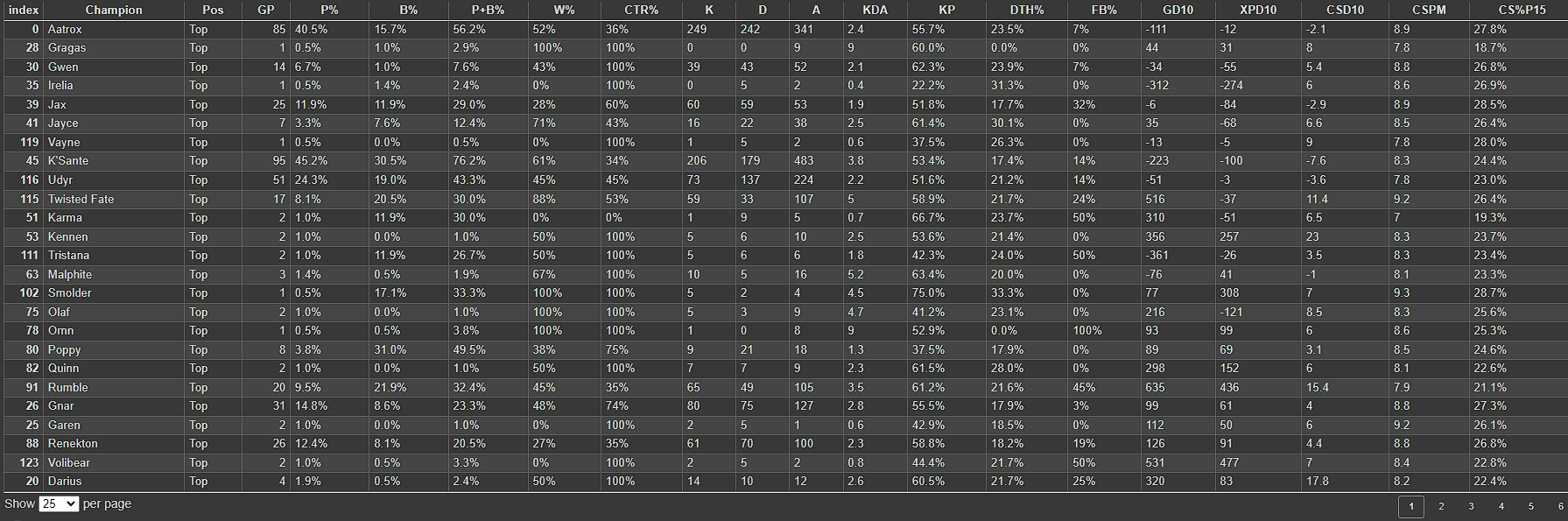 챔프, 포지션 별로 나눠져 있고, 승률, 밴픽률, 총킬, 총데스 심지어는 퍼스트블러드 확률, 분당 와드 점수 같은 세세한 정보들도 다 모여있다.