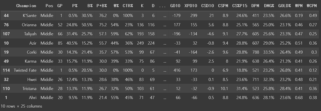 우선 데이터를 쭉 보기 위해서 탑, 정글, 미드, 원딜, 서폿 순으로 정렬을 해보자.