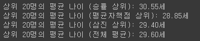 print(f"상위 20명의 평균 나이 (전체 평균): {average_age_total:.2f}세")